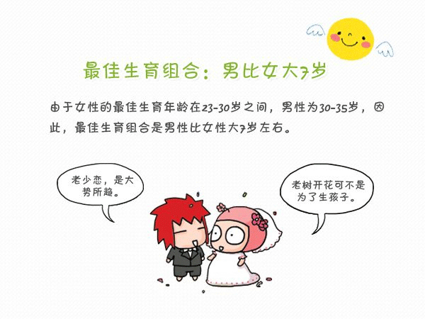 经过多项研究及临床证明,女性最佳生育年龄在23岁~28岁,而男性的最佳生育年龄在30岁~35岁,这个数据除了从精子质量和卵子质量上考虑外,还有各种因素,如:家庭经济情况、女性怀孕危险等问题。