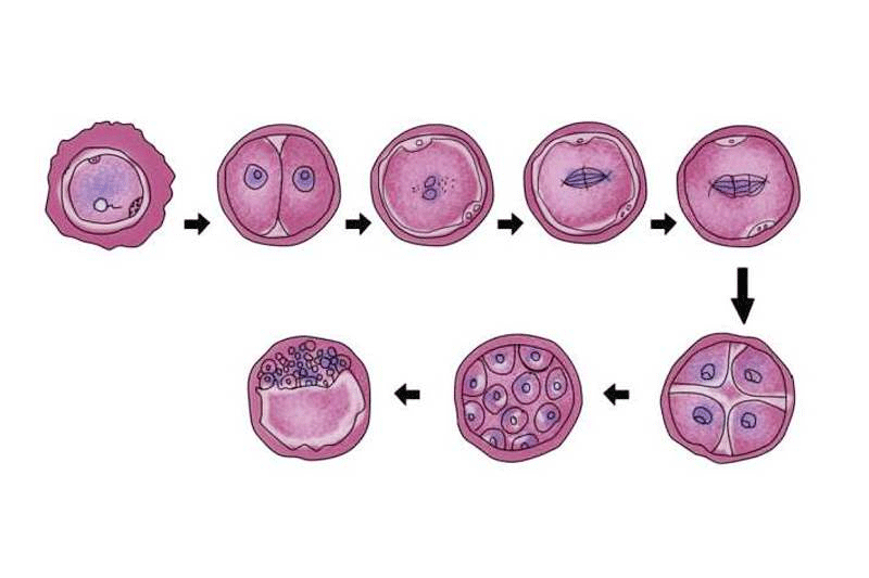 受精卵开始进行有丝分裂的同时,在输卵管内借着输卵管蠕动和纤毛推动,向子宫腔方向移动,约在受精后第3~4日,分裂成由16个细胞组成的实心细胞团,称桑椹胚,继续发育成为囊胚。