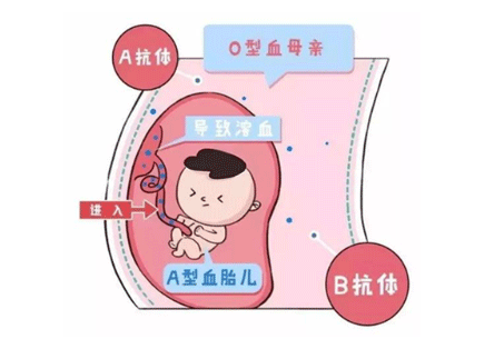 - 新生儿溶血的机制为:我们人类的血型有四种,分别为A、B、AB及O型。血型的分类依红细胞表面的抗原型来分,A型血的人红细胞表面抗原为A,B型为B,AB型为A和B,O型血的人红细胞表面没有抗原。当孕妇为“O”型而丈夫为“A”,“B”或“AB”型时,胎儿从父亲方面遗传来的血型,作为抗原进入母体,刺激母体产生特殊的抗A或抗B抗体,而这种抗体又可以通过胎盘回到胎儿,破坏胎儿的红细胞,引起胎儿溶血的发生。