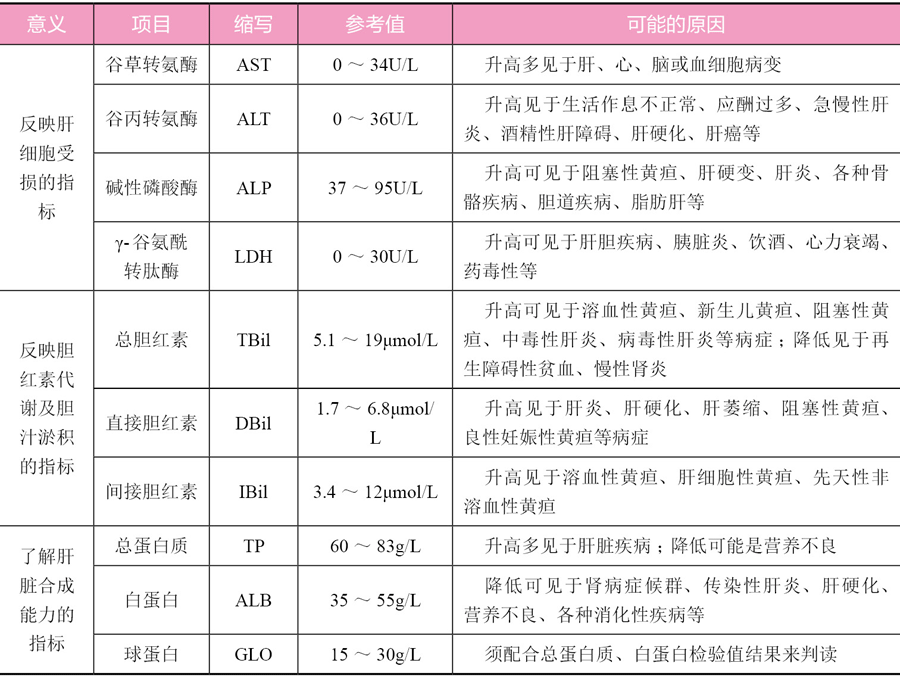 包括谷丙转氨酶、谷草转氨酶、碱性磷酸酶以及谷氨酰转肽酶等,可反映肝细胞和胆管细胞受损的状态;如果这些指标出现异常的增高,提示有肝细胞受损或者胆管细胞受损。