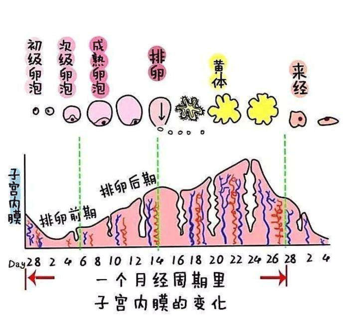 ②、分泌期,子宫内膜的厚度约为5~6mm,该期与卵巢周期中的黄体期相对应;