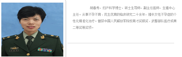 胡春秀,中国人民武装警察部队特色医学中心 生殖中心,副主任医师,副教授。