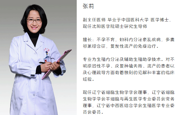 张莉,沈阳市妇婴医院生殖医学中心主任医师,硕士生导师,毕业于中国医科大学,医学博士。现任辽宁省细胞生物学学会理事,辽宁省细胞生物学学会干细胞与再生医学专业委员会常务理事,辽宁省中西医结合学会生殖医学专业委员会委员。