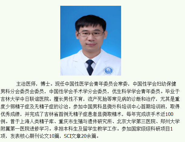 他曾在全国首届显微外科培训班北医三院进修学习,完成全省首例显微取精,擅长男性少弱畸形精子症治疗,无精子症的诊断及治疗,男性性功能的治疗,泌尿系感染诊治。吉大一院试管团队男科负责人。吉林省唯一可行无精子症行显微取精手术医生。