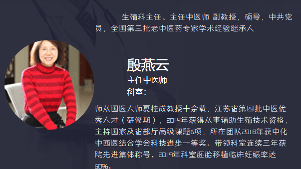 殷燕云,江苏省中医院生殖医中心副主任医师,生殖科主任,主任中医师,副教授,硕导,中共党员,全国第三批老中医药专家学术经验继承人,师从国医大师夏桂成教授十余载,江苏省第四批中医优秀人才(研修期),南京中医药大学学报审稿专家。