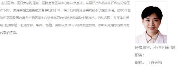 颜晓红,厦门大学附属第一医院生殖医学中心主任医师,1996年毕业于福建医科大学医学系,厦门大学附属第一医院生殖医学中心临床负责人,从事妇产科临床和妇科内分泌工作14年,熟练掌握宫腹腔镜及各种妇科手术,精于妇科内分泌疾病和不孕症的诊治。