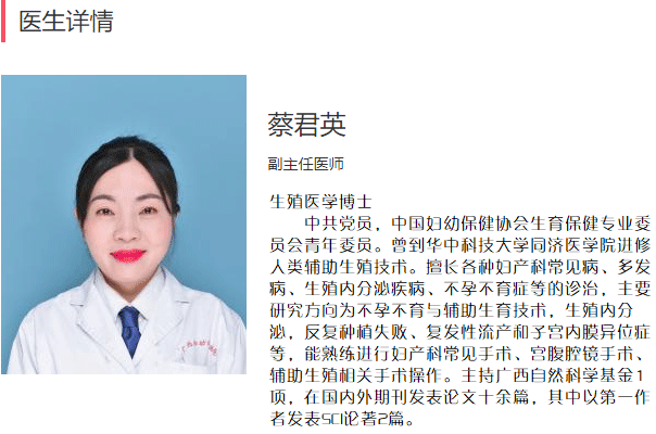 蔡君英,广西壮族自治区妇幼保健院生殖医学中心副主任医师,生殖医学博士,中共党员,中国妇幼保健协会生育保健专业委员会青年委员。曾到华中科技大学同济医学院进修人类辅助生殖技术。