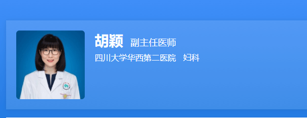 胡颖,四川大学华西第二医院妇科副主任医师,妇产科生殖内分泌专业博士,澳大利亚新南威尔士大学访问学者。2009年毕业于四川大学华西临床医学院七年制专业,毕业留校后从事妇产科临床、教学和科研的相关工作。主持国家自然科学基金青年基金1项,主持四川大学教改项目1项,主研国家自然科学基金-面上项目及省科技厅重点专项各1项,参研多项国家及省级课题。
