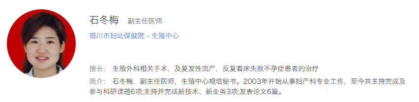 石冬梅,银川市妇幼保健院生殖中心副主任医师。